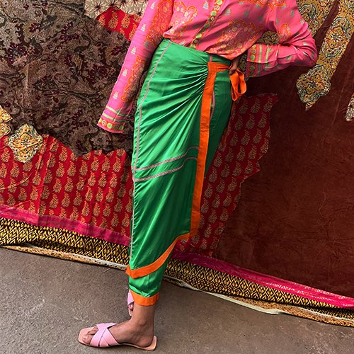 CONTRAST LACE INSERTED, PANELLED WRAP SKIRT WITH RUCHING AND CONTRAST BORDERS