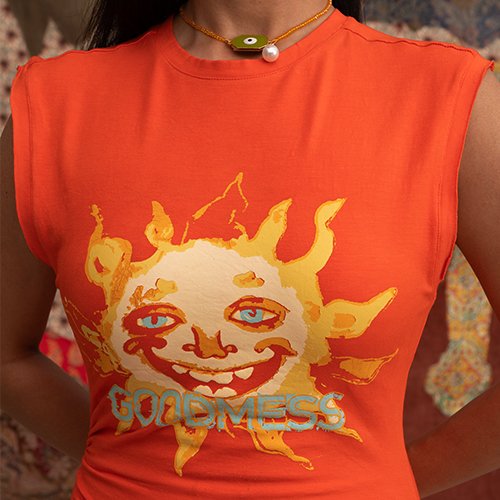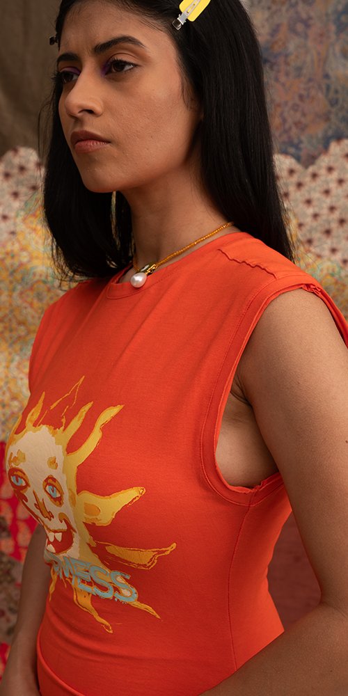 Our body hugging dress oozes confidence and comfort- emotions that reflect acceptance of reality. The sarcastic artwork embodies the idea of a ‘good mess’. Which in reference to our collection’s theme means being ok while having an ambiguous cultural identity.