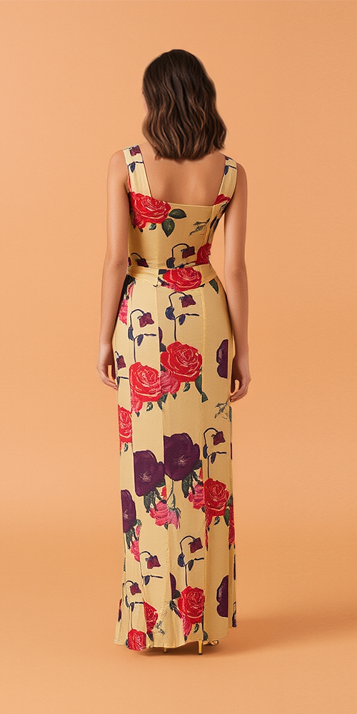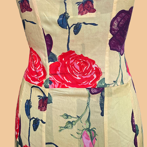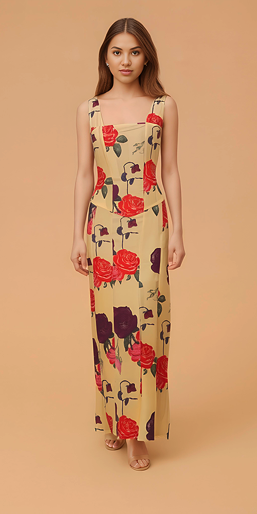SLEEVELESS, FIT & FLARE STYLE MAXI DRESS WITH PRINCESS PANELS, WAIST SEAM, SIDE ZIPPER AND GODET INSERTS
